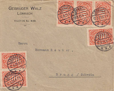 Foreign cover (1-20 g) from 17.08.1923 (15. Period) franked with 6 stamps a 500 Mark (=3 000 Mark) |