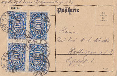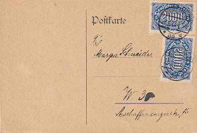 Inland postcard from 28.08.1923 (16. Period) franked with 4 stamps a 2 000 Mark (=8 000 Mark) |