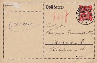 Inlandspostkarte vom 17.10.1922 (9. Periode) frankiert mit einer Marke a 3 Mark (=3 Mark) |