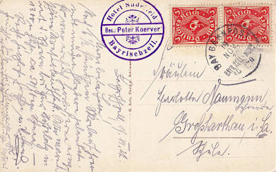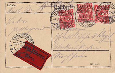 Inlandspostkarte vom 19.11.1922 (10. Periode) frankiert mit 2 Marken a 3 Mark (=6 Mark) |
