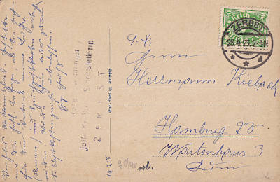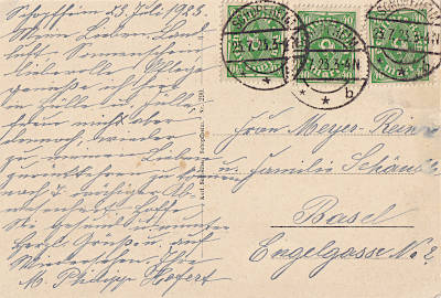 Auslandspostkarte vom 23.07.1923 (14. Periode) frankiert mit 3 Marken a 40 Mark (=120 Mark); in die Schweiz galt bis 30 km der Inlandstarif |
