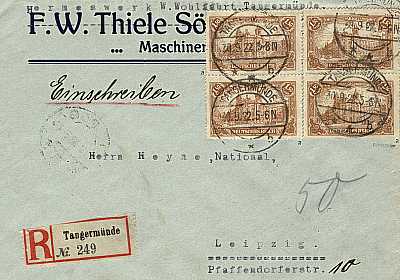 Inlandsbrief mit Einschreiben (21-100 g) vom 30.09.1922 (8. Periode) frankiert mit 4 Marken a 1,50 Mark (=6 Mark, 3 Brief 3 Einschreiben) |
