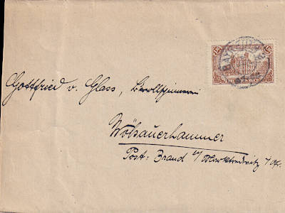 Inlandsbrief (21-100 g) vom 23.03.1922 (7. Periode) frankiert mit 2 Marken a 1,50 Mark (=3 Mark) |