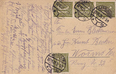 Ortspostkarte vom 27.12.1921 (6. Periode) frankiert mit 3 Marken a 10 Pfennig (=30 Pfennig) |