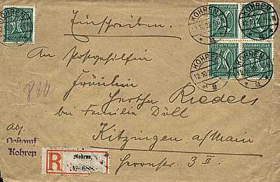 Inlandsbrief mit Einschreiben (21-100 g) vom 12.10.1922 (9. Periode) frankiert mit 40 Marken a 30 Pfennig (=12 Mark, 8 Brief 4 Einschreiben) |