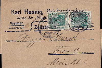 Foreign printed matter (101-250 g) from 03.08.1913 franked with 2 stamps a 5 Pfennig (=10 Pfennig)
