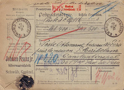 Auslandspaketkarte mit Wertangabe (400 Mark) (5 000 g) vom 10.11.1917 frankiert mit 3 Marken (=2,70 Mark)