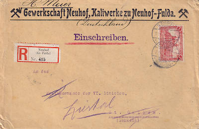 Auslandsbrief mit Einschreiben (120-140 g) vom 22.06.1917 frankiert mit einer Marke a 1 Mark (=1 Mark, 0,80 Brief 0,20 Einschreiben)
