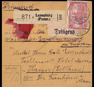 Inland parcel card with urgend transport (4 500 g, > 75 km) from 15.02.1918 franked with 2 stamps a 1 Mark (=2 Mark, 1,80 parcel 0,20 special delivery) |