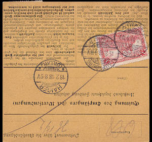 Inland parcel card with special delivery (5 000 g, > 75 km) from 27.08.1917 franked with 2 stamps a 50 Pfennig (=1 Mark, 0,60 parcel 0,40 special delivery) |