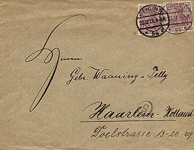 Foreign cover (1-20 g) from 28.07.1921 franked with 2 stamps a 60 Pfennig (=1,20 Mark) |