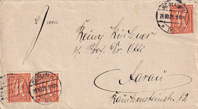 Foreign cover (1-20 g) from 21.10.1921 franked with 3 stamps a 40 Pfennig (=1,20 Mark) |