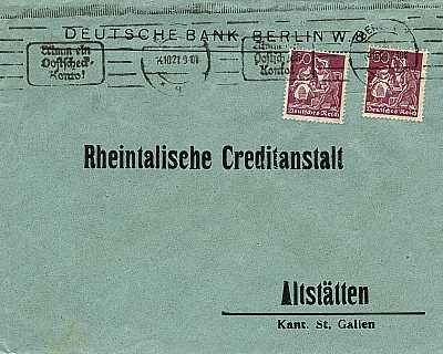 Foreign cover (1-20 g) from 14.10.1921 franked with 2 stamps a 60 Pfennig (=1,20 Mark) |