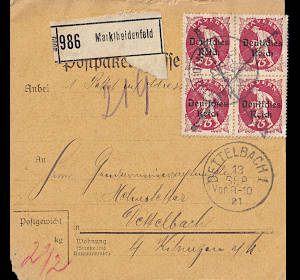 Inlandspaketkarte (2 500 g, < 75 km) vom 13.09.1921 frankiert mit 4 Marken a 75 Pfennig (=3 Mark)