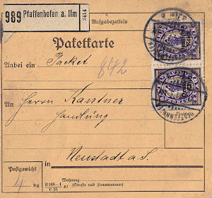 Inlandspaketkarte (9 500 g, > 75 km) vom 03.08.1921 frankiert mit 2 Marken a 4 Mark (=8 Mark)