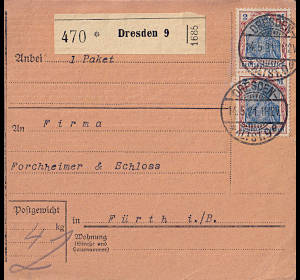 Inlandspaketkarte (4 000 g, > 75 km) vom 14.05.1921 frankiert mit 2 Marken a 2 Mark (=4 Mark)