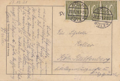 Ortspostkarte vom 27.12.1921 frankiert mit 3 Marken a 10 Pfennig (=30 Pfennig)