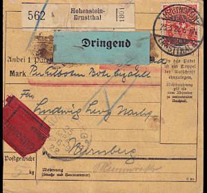 Inland cover with special delivery (1-20 g) from 22.04.1922 franked with 2 stamps a 2½ Mark (=5 Mark, 2 cover 3 special delivery) |