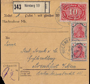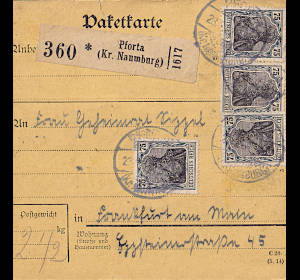 Inland parcel card (16 500 g, > 75 km) from 17.06.1922 franked with 4 stamps a 10 Mark on 75 Pfennig (=40 Mark) |