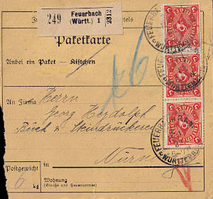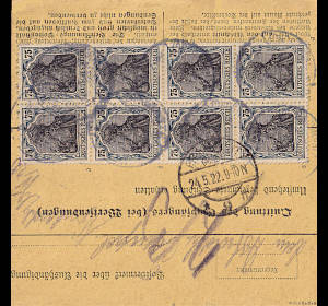Inland parcel card (9 500 g, > 75 km) from 30.05.1922 franked with 3 stamps (=18 Mark) |