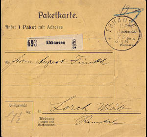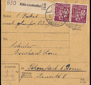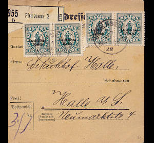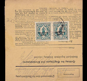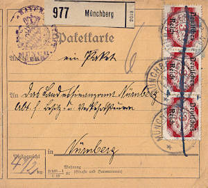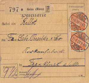 Inland parcel card (2 000 g, < 75 km) from 08.06.1922 franked with 2 stamps a 3 Mark on 1¼ Mark (=6 Mark) |