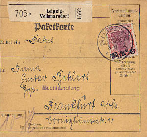 Inland parcel card (9 500 g, > 75 km) from 02.06.1922 franked with 12 stamps a 1,50 Mark (=18 Mark) |