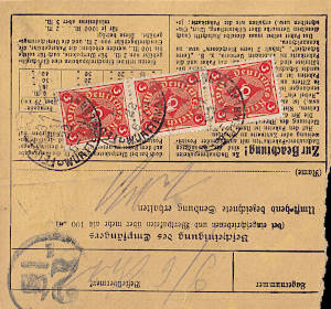 Inland parcel card (3 500 g, > 75 km) from 07.03.1922 franked with 6 stamps a 1½ Mark (=9 Mark) |
