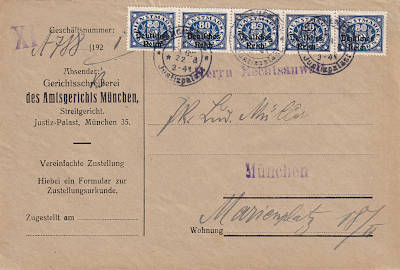 Ortsbrief mit Zustellungsurkunde (1-20 g) vom 05.02.1922 frankiert mit 5 Marken a 80 Pfennig (=4 Mark, 1,25 Brief 1,50 Zustellung 1,25 Urkunde) |