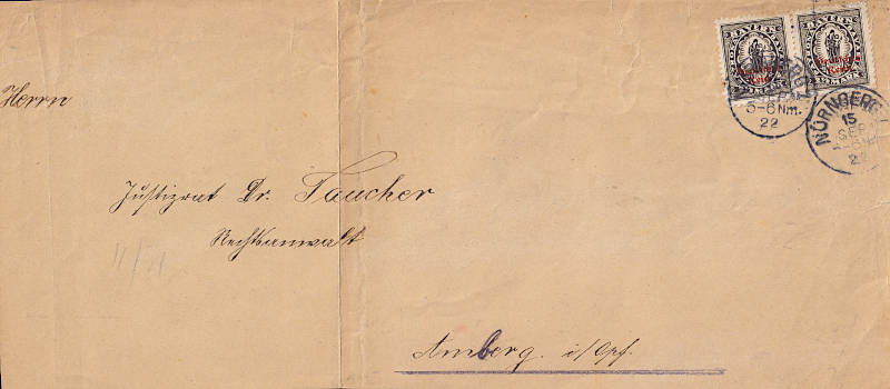 Inland cover (1-20 g) from 04.09.1922 franked with 2 stamps a 1½ Mark (=3 Mark) |