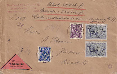 Inland cover with value (3 000 Mark) and cash on delivery (32 g) from 21.11.1922 franked with 4 stamps (=48 Mark, 16 cover 8 registeration 18 value 6 cash on delivery)