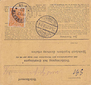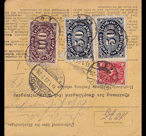 Inlandspaketkarte (9 500 g, > 75 km) vom 22.12.1922 frankiert mit 3 Marken (=500 Mark) |