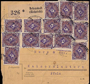 Inlandspaketkarte (1 500 g, < 75 km) vom 22.12.1922 frankiert mit 16 Marken (=125 Mark) |