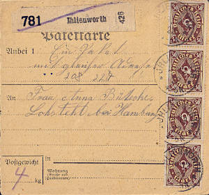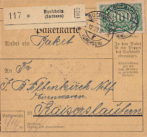 Inlandspaketkarte (4 000 g, < 75 km) vom 19.12.1922 frankiert mit 5 Marken (=125 Mark) |