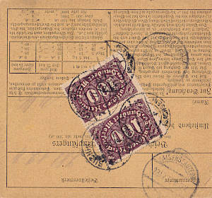 Inlandspaketkarte (3 000 g, > 75 km) vom 13.01.1923 frankiert mit 2 Marken (=250 Mark) |