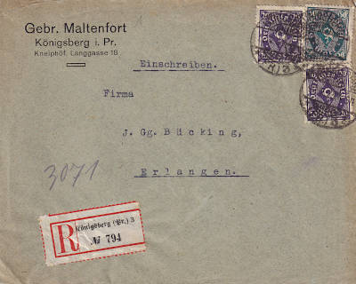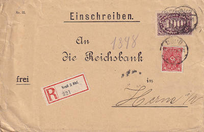 Inland cover with registeration (1-20 g) from 22.02.1923 franked with 3 stamps (=90 Mark, 50 cover 40 registeration) |