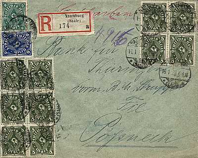 Inland cover with registeration (1-20 g) from 27.01.1923 franked with 30 stamps a 3 Mark (=90 Mark, 50 cover 40 registeration) |