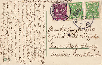 Foreign postcard from 30.04.1923 franked with 3 stamps (=180 Mark)