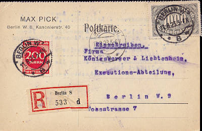 Local postcard with registeration from 11.08.1923 franked with 2 stamps (=1 200 Mark, 200 postcard 1 000 registeration)