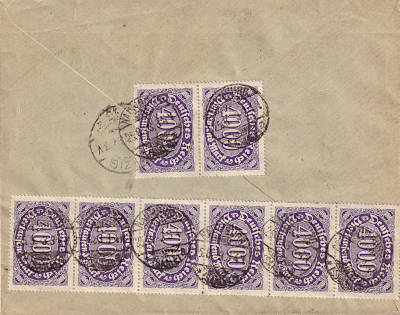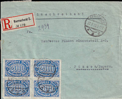 Inlandsbrief mit Einschreiben (1-20 g) vom 25.08.1923 frankiert mit 10 Marken a 4 000 Mark (=40 000 Mark, 20 000 Brief 20 000 Einschreiben) |