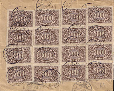 Inlandsbrief mit Eilzustellung (1-20 g) vom 29.08.1923 frankiert mit 20 Marken a 3 000 Mark (=60 000 Mark, 20 000 Brief 40 000 Eilzustellung)