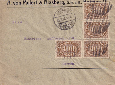 Ortsbrief (1-20 g) vom 31.08.1923 frankiert mit 20 Marken a 400 Mark (=8 000 Mark) |