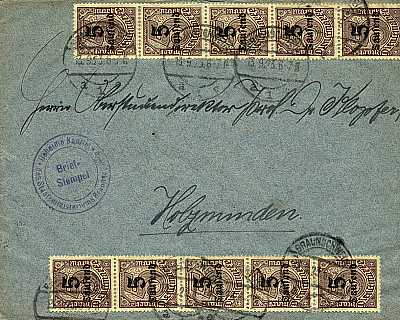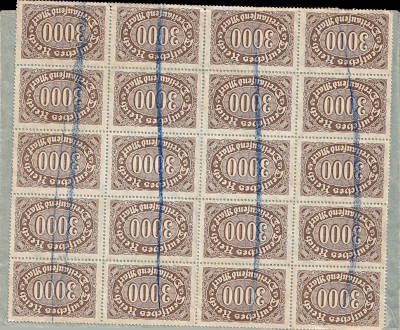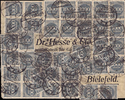 Inland cover (1-20 g) from 05.09.1923 franked with 25 stamps a 3 000 Mark (=75 000 Mark) |