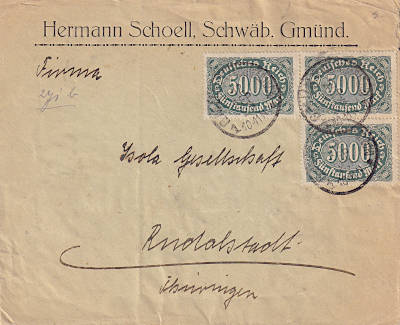 Inland cover (1-20 g) from 04.09.1923 franked with 15 stamps a 5 000 Mark (=75 000 Mark) |