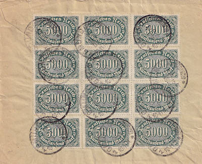 Inland cover (1-20 g) from 19.09.1923 franked with 15 stamps a 5 000 Mark on 5 Mark (=75 000 Mark) |