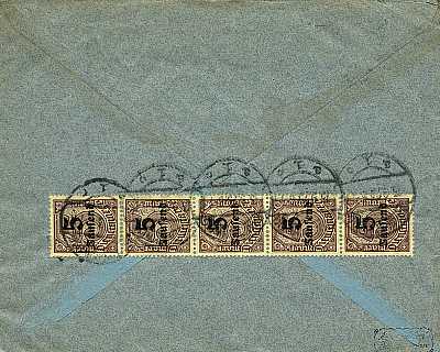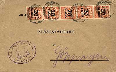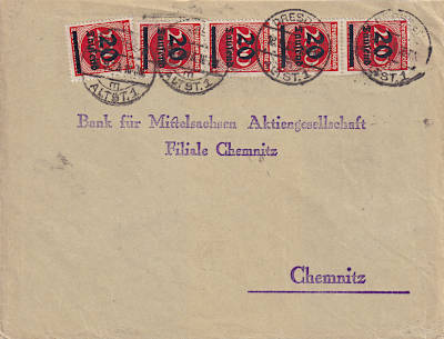Inland cover (21-100 g) from 18.09.1923 franked with 5 stamps a 20 000 Mark on 200 Mark (=100 000 Mark) |