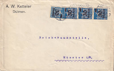 Inland cover (101-250 g) from 04.09.1923 franked with 4 stamps a 30 000 Mark on 10 Mark (=120 000 Mark) |