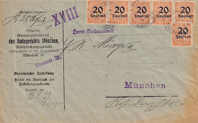 Ortszustellungsauftrag (1-20 g) vom 18.09.1923 frankiert mit 36 Marken (=135 000 Mark,