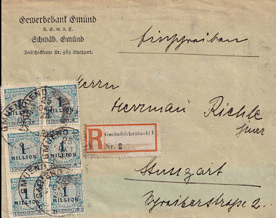 Inlandsbrief mit Einschreiben (1-20 g) vom 23.10.1923 frankiert mit 4 Marken a 5 Millionen Mark (=20 Millionen Mark, 10 Millionen Brief 10 Millionen Einschreiben) |