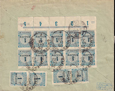 Inlandsbrief mit Einschreiben (1-20 g) vom 27.10.1923 frankiert mit 10 Marken a 2 Millionen Mark auf 200 Mark (=20 Millionen Mark, 10 Millionen Brief 10 Millionen Einschreiben) |