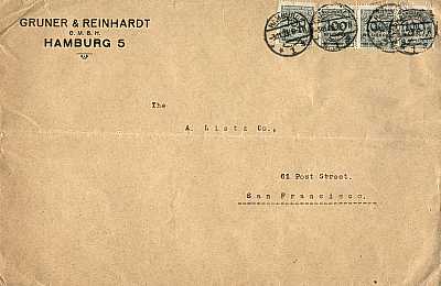 Foreign cover (41-60 g) from 03.11.1923 franked with 4 stamps a 100 Million Mark (=400 Million Mark) |
